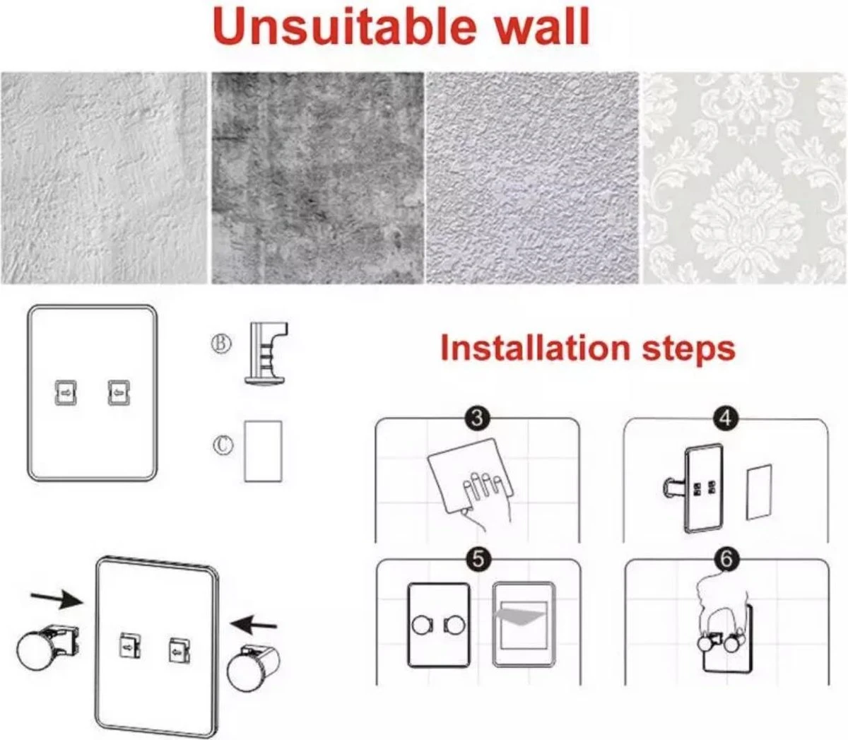 - Duurzaam – sterke kleverige lijm, hoog draagvermogen, dat de kwaliteit en levensduur verzekert.Traceless merk, geen lijm, geen zorgen over beschadiging van het oppervlak.