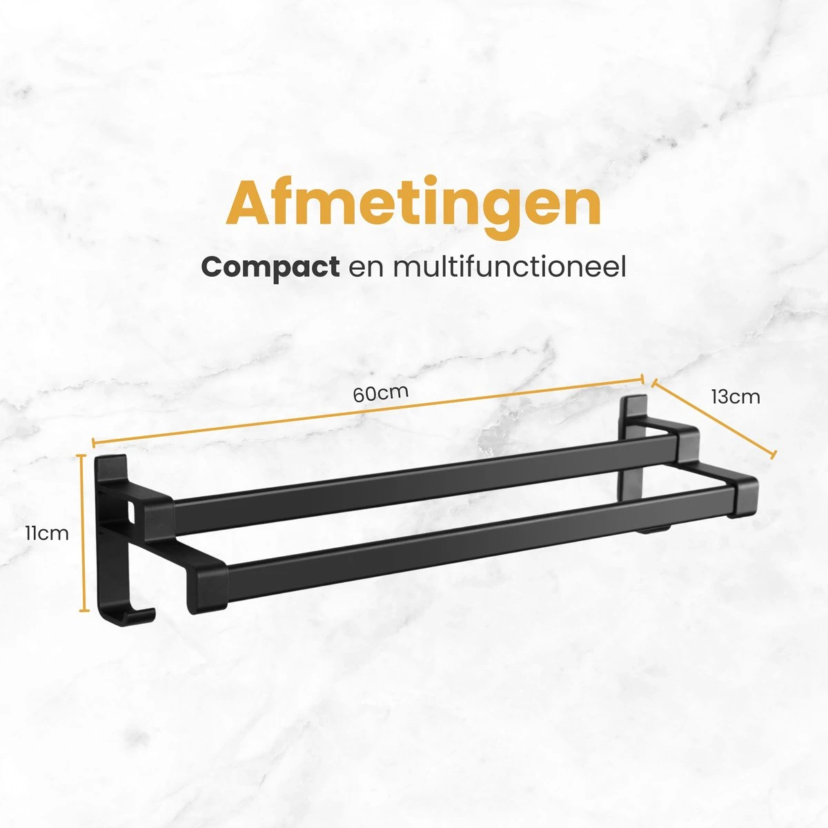 Het zwarte dubbele stang handdoekenrek is van aluminium en heeft daardoor een lichtgewicht. Het minimalistische ontwerp heeft een luxe, moderne uitstraling en past daardoor in elk interieur. Hang het handdoekrek in de badkamer of in de keuken en geniet van het stijlvolle design.
