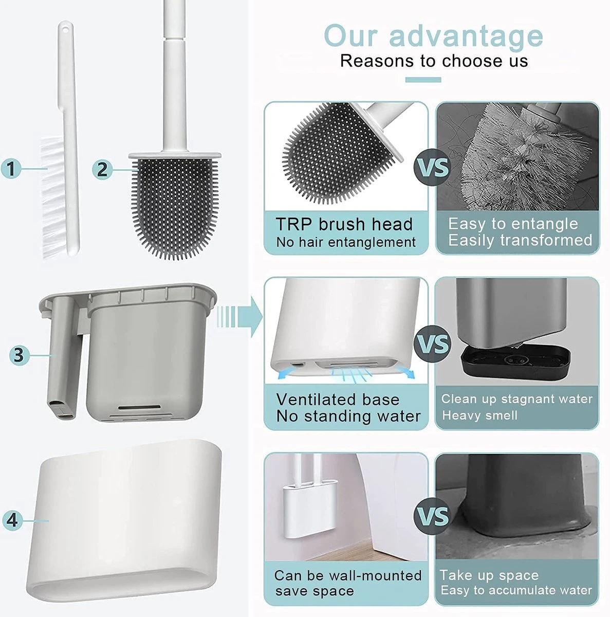 Flexibele siliconen platte puntige borstel kan de rand van het toilet beter reinigen door de borstelkop in verschillende hoeken te buigen. Voor doodlopende wegen, uitgerust met een gebruiksvriendelijkere reinigingsborstel