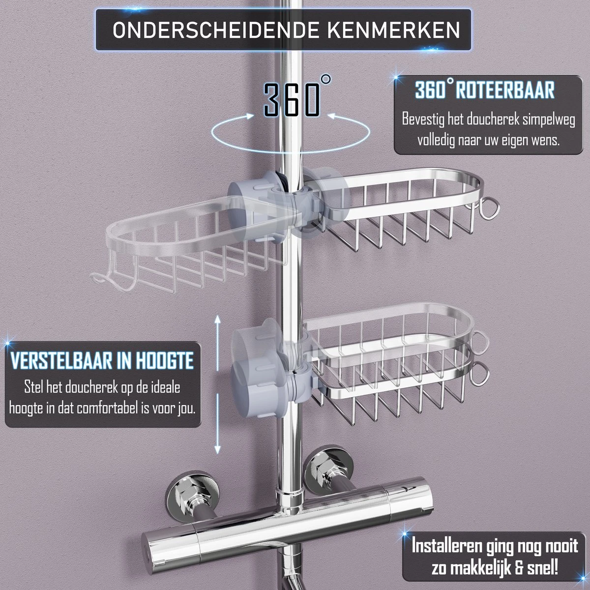 Een nette douche zorgt ook direct voor een nettere badkamer! We kennen allemaal het probleem van een overvloed aan producten op de vloer. Onze doucherekken helpen je de chaos te organiseren. Dit rek neemt namelijk weinig ruimte in beslag en kan in alle ruimtes geplaatst worden, zowel groot als klein. Zo geef je al je douchespullen een plekje en hoef je niks meer op de grond te zetten.