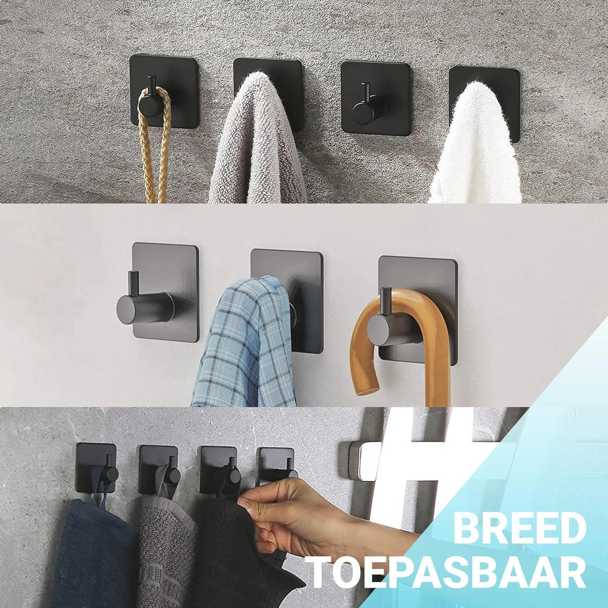 De handdoekhaakjes zijn zeer eenvoudig te plaatsen, het enige wat je hoeft te doen is de zelfklevende achterzijde van de handdoekhaak tegen een schoon en vlak oppervlak te drukken en enkele seconden vast te houden. De handdoekhaakjes zullen stevig en veilig op hun plaats blijven zitten. Doordat je geen gaten hoeft te boren, blijft je muur volledig intact.