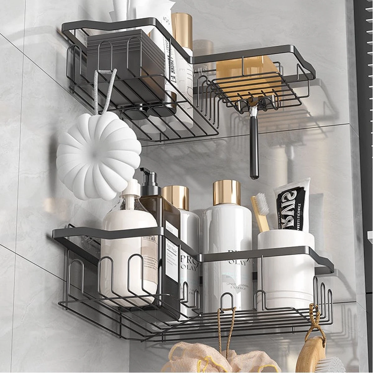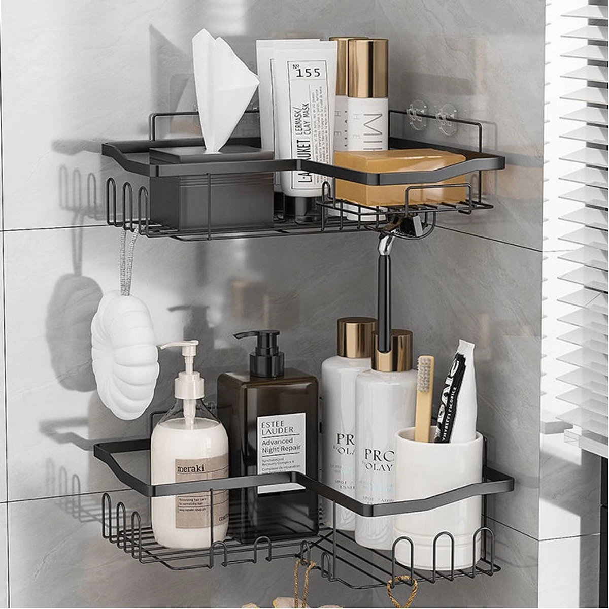 STRICX Doucherekhoek 2 Laags Zwart – Zonder Boren – Zelfklevend Doucherek – Doucherek – Doucherek Voor Badkamer/ Keuken – Doucherek Met Plakstrip – Keukenrek Met Plakstrip – Badrek Douche – Doucherek Hoekvorm – Badkamerrek Douchemandje
