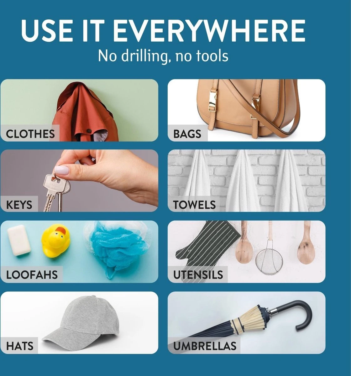 Set van 6 heavy duty zelfklevende ophanghaakjes. Deze haakjes zijn te bevestigen op iedere vlakke ondergrond en zijn voorzien van een supersterke plakstrip met een draagvermogen tot liefst 8kg. Ideaal voor het ophangen van handdoeken, kleding, jassen, sleutels, keukengereietc. Omdat de haken vervaardigd zijn uit robuust roestvrij staal kunnen ze ook gebruikt worden in ruimtes met een hoge luchtvochtigheid zoals de badkamer.