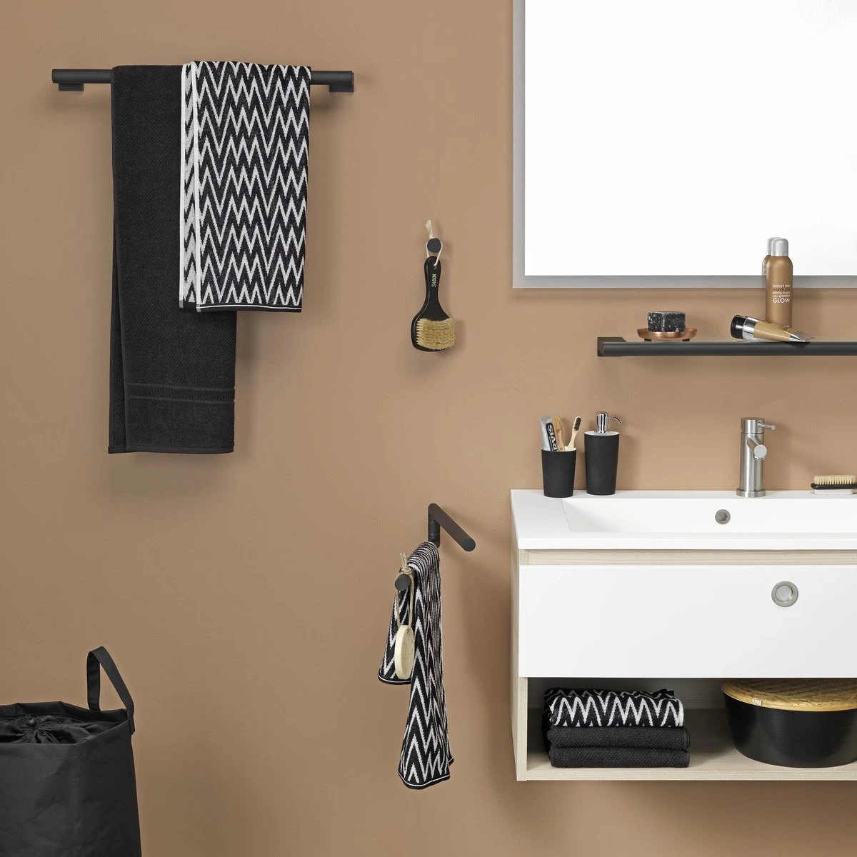 Het 2-armige handdoekrek uit de Tiger Bold serie is uitgevoerd in de kleur mat zwart. De beweegbare armen bieden plaats aan twee handdoeken en geven een optimale invulling aan de ruimte rondom de wastafel. Het 2-armige handdoekrek is eenvoudig te bevestigen, doordat gebruik gemaakt wordt van een muurplaatje zijn de bevestigingsmaterialen niet zichtbaar. De Bold serie bestaat tevens uit een groot aantal aanvullende accessoires voor de badkamer en het toilet, allemaal in één stijl.