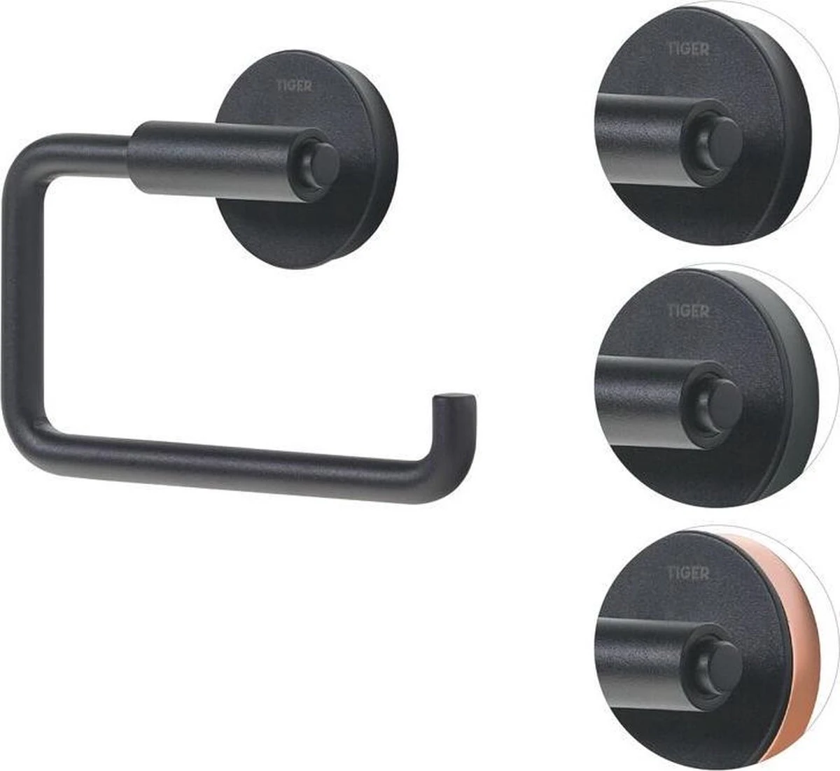 De toiletrolhouder uit de Urban serie van Tiger is uitgevoerd in de kleur mat zwart en wordt geleverd met twee decor ringen. De decor ringen, in de kleur koper en grijs, maken het mogelijk een subtiel kleuraccent toe te voegen. Het is ook mogelijk de toiletrolhouder zonder de decor ring te monteren waardoor het zeer eenvoudig is om het product aan de gewenste stijl aan te passen. Bij de montage van het artikel wordt gebruik gemaakt van een muurplaatje waardoor de bijgeleverde bevestigingsmaterialen uit het zicht verdwijnen. De Urban serie bevat tevens een groot aantal aanvullende accessoires voor de badkamer en toiletruimte. Alle in dezelfde stijl. De toiletrolhouder is tevens geschikt voor montage met TigerFix type 1, waarmee accessoires snel en eenvoudig op een gladde, harde ondergrond te bevestigen zijn door middel van een gepatenteerd lijmsysteem. Boren is niet noodzakelijk en de accessoires zijn eenvoudig te verwijderen zonder dat er resten op de ondergrond achterblijven. TigerFix is apart verkrijgbaar.