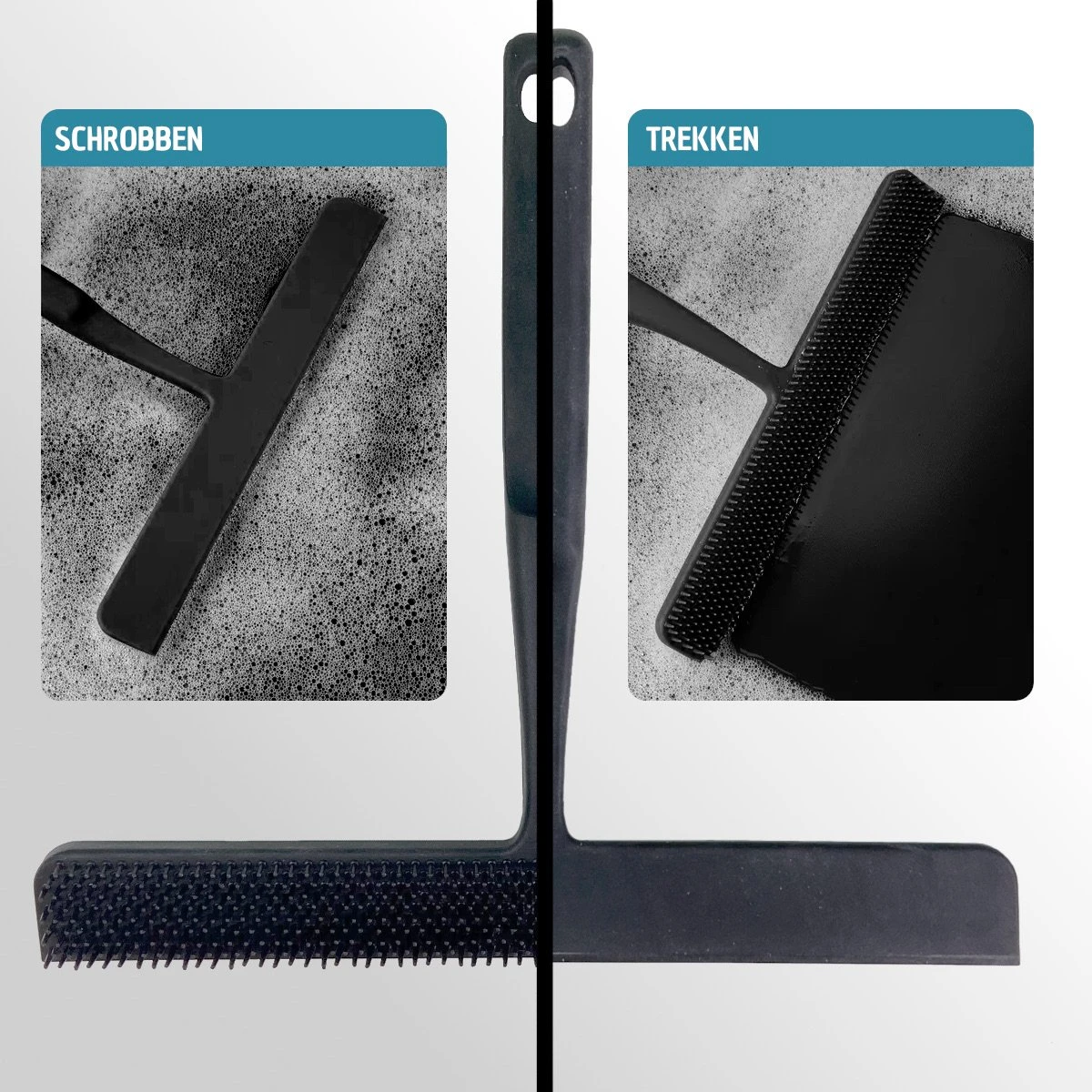 Of je nu na het douchen alleen even de douchewand droog wilt maken of je wilt de ramen aan de buitenkant eens een goede wasbeurt geven, met deze wisser of trekker is het heel eenvoudig. De douchewisserheeft namelijk twee kante: een kant met zachte siliconen borstelharen voor het schrobben of inwrijven van schoonmaakmiddel en de andere kant met een trekker om dit er vervolgens weer af te trekken. Doordat de trekker gemaakt is van zacht siliconen sluit deze altijd goed aan op de ondergrond waardoor je streeploos schoonmaakt.