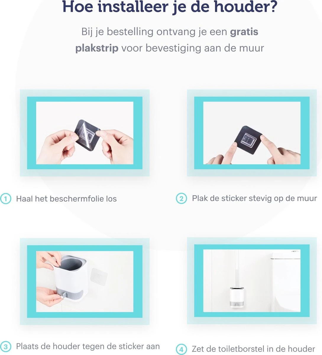 - Stijlvol opbergen – Het minimalistische wit-grijze design past thuis in iedere badkamer. Zet jij de toiletborstelhouder het liefst op de grond of hang je hem graag op? De keuze is aan jou, want bij bestelling ontvang je een gratis stevige plakstrip voor bevestiging aan de muur.